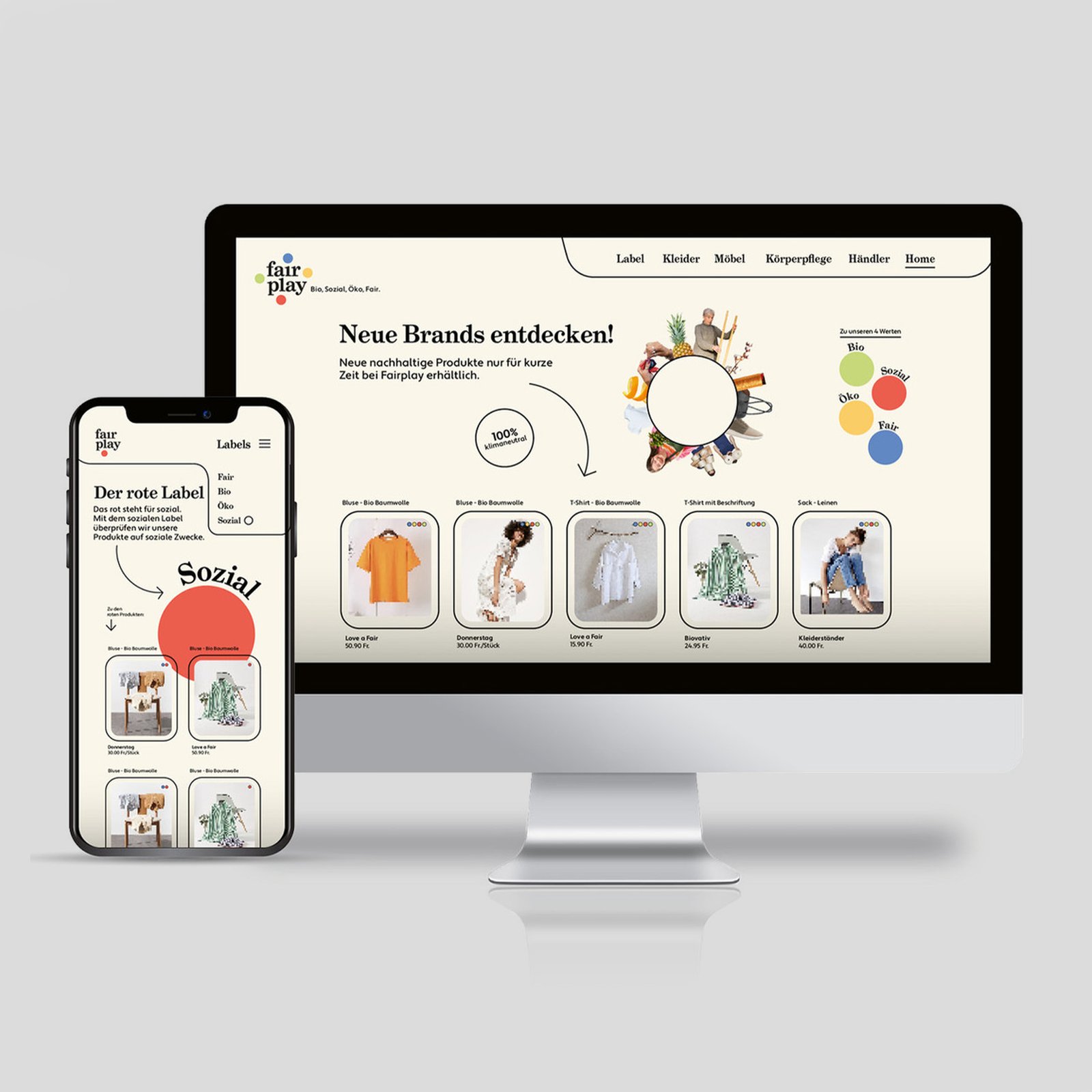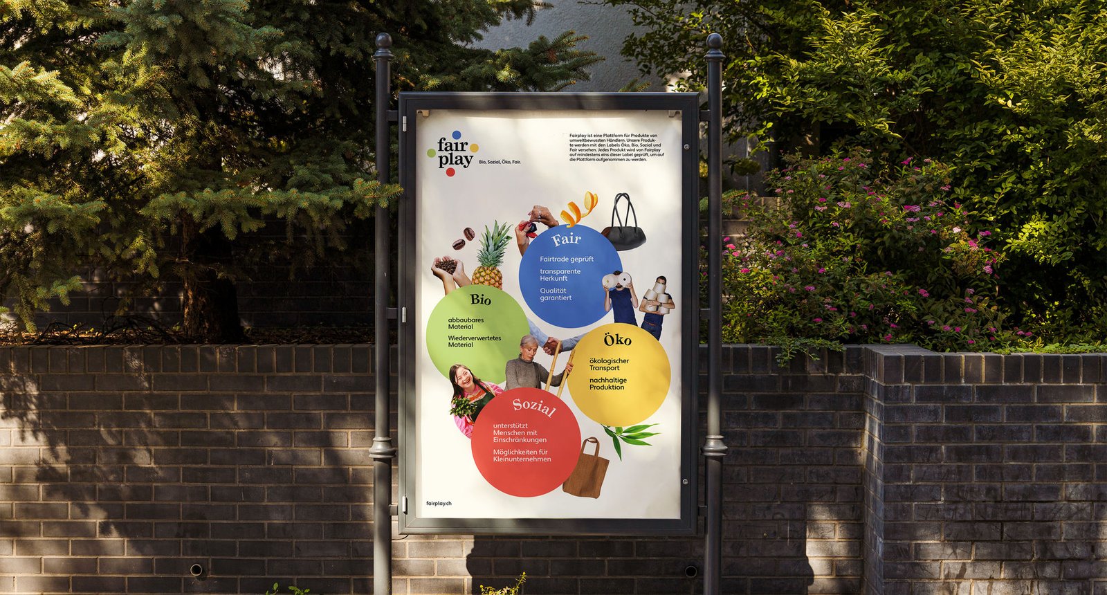 Fairplay, previously named Faircustomer, is an eco-friendly platform for big and small businesses. Each circle in the logo represents one of Fairplay’s four labels: eco, fair, social and organic, which represent the categories on the Website. The products have to fulfill at least one of these values to be listed in the online store.